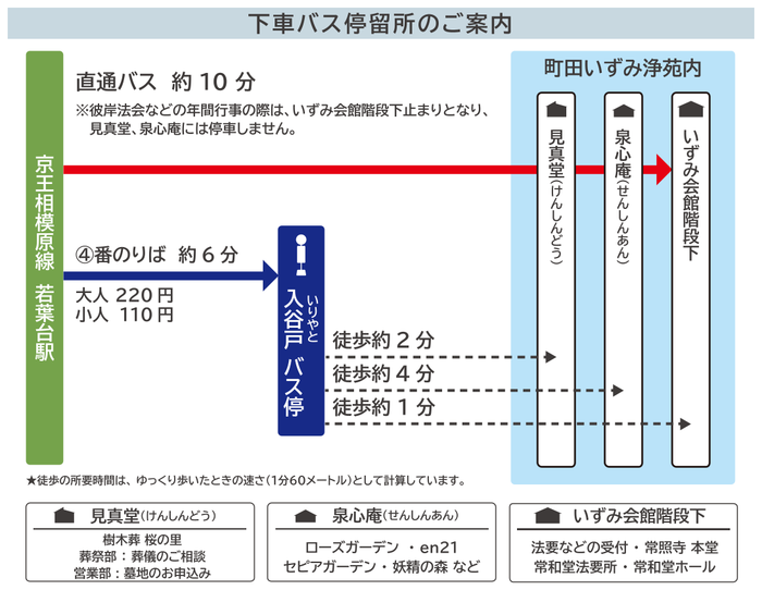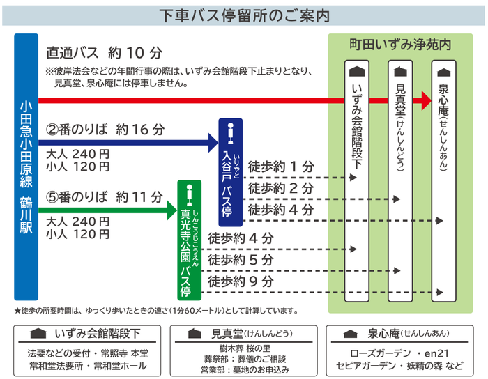 直通バスは町田いずみ浄苑内の3ヶ所(見真堂(けんしんどう)・泉心庵(せんしんあん)・いずみ会館階段下)に停車します。